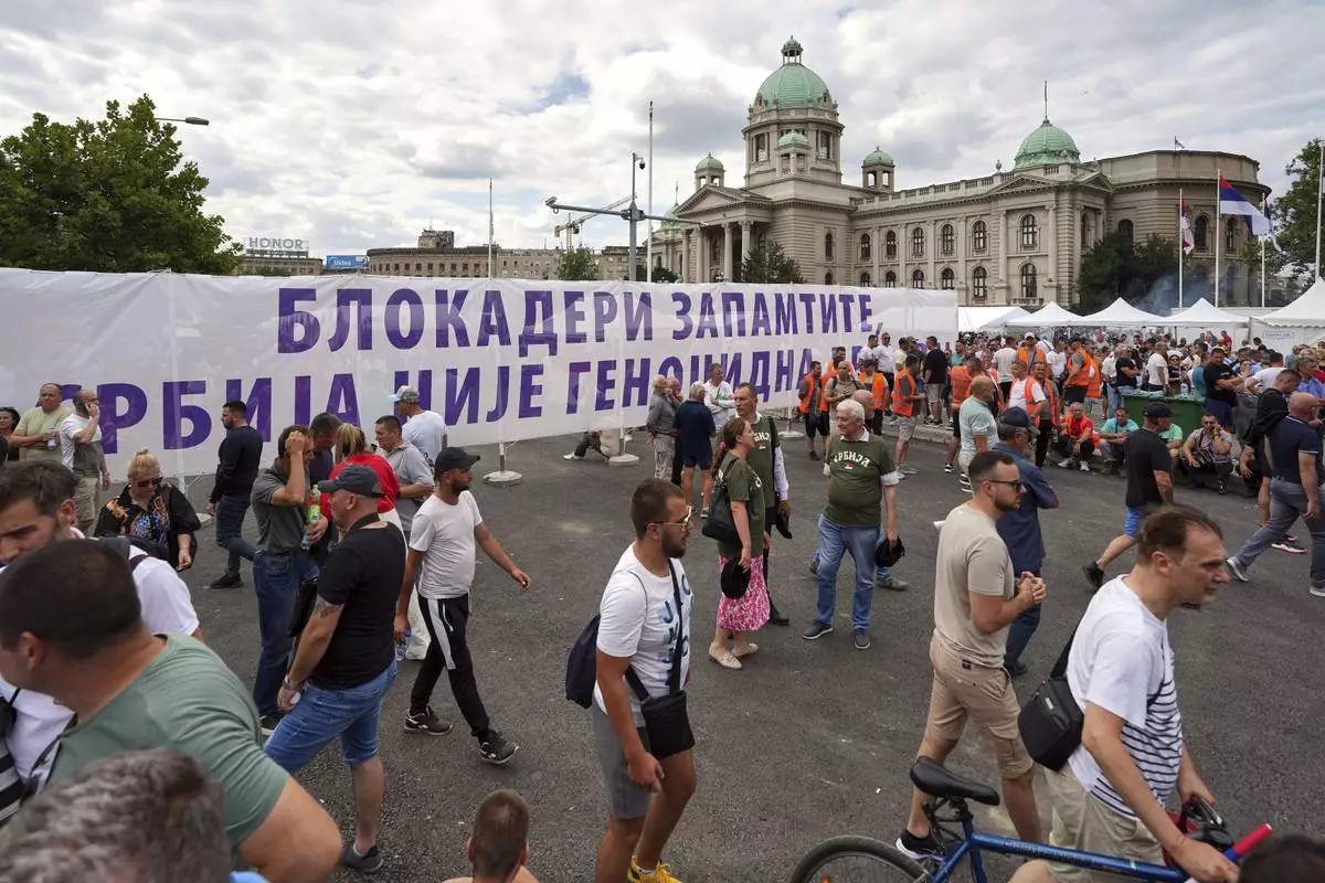 Government supporters hold a banner that reads "Blockaders - Remember - Serbia is not a genocidal state" outside the Parliament building ahead of a major anti-government rally pressing for an early election after nearly eight months of almost daily anti-corruption demonstrations that have shaken the populist government of President Aleksandar Vucic, in Belgrade, Serbia, Saturday, June 28, 2025. (AP Photo/Darko Vojinovic)