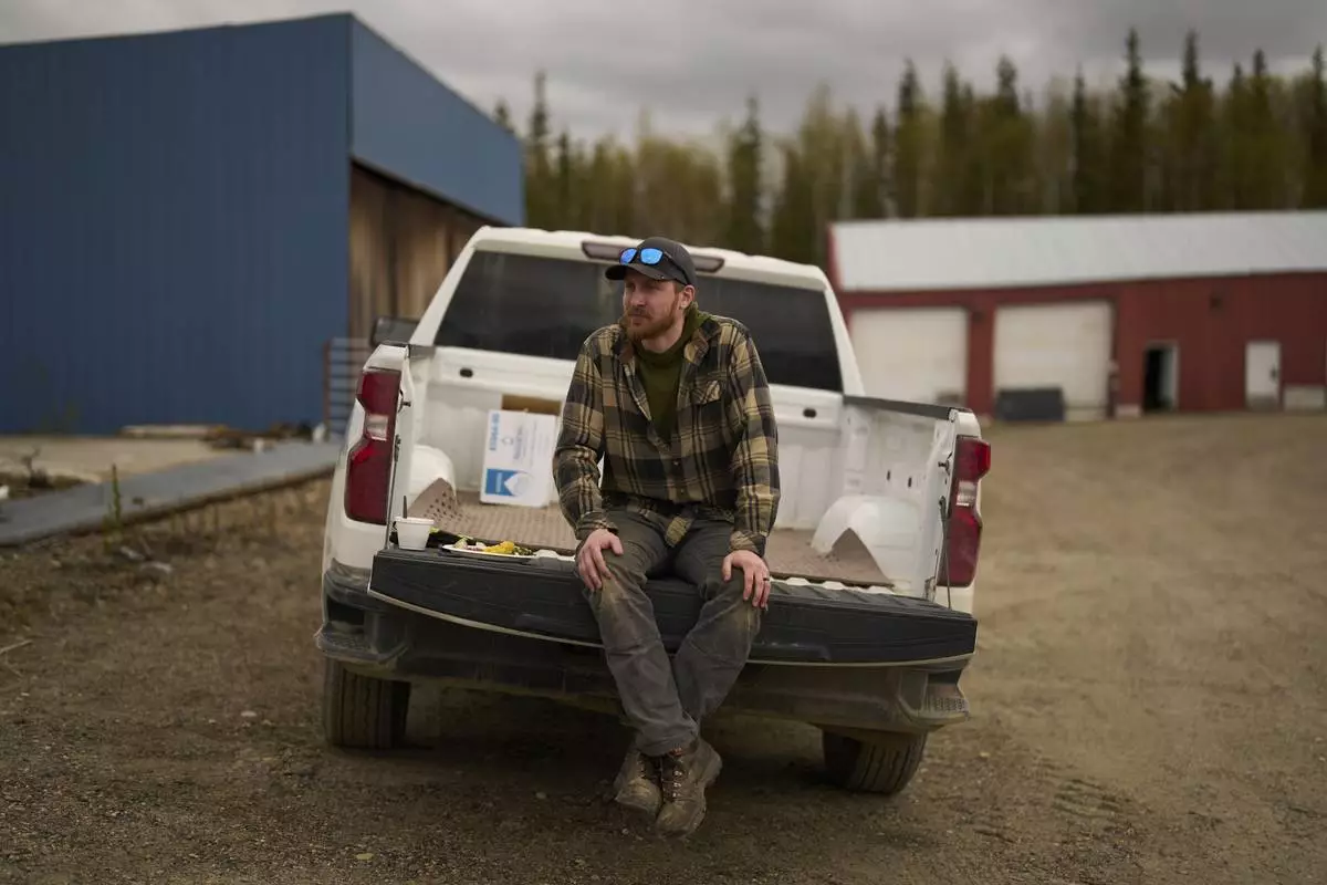 Will Kramer, Applied Mechanics instructor at the Galena Interior Learning Academy, sits on the bed of a truck Wednesday, May 21, 2025, in Galena, Alaska. (AP Photo/John Locher)