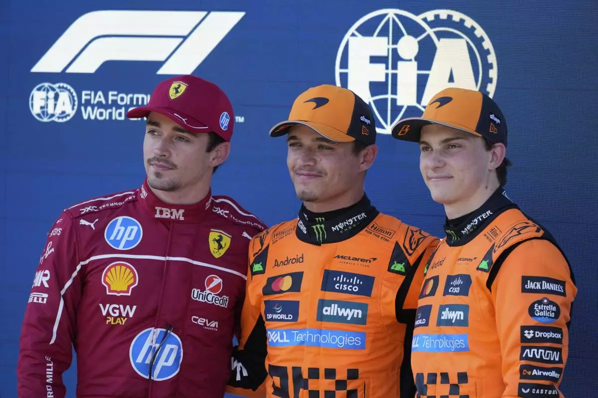 Frome the left, Ferrari driver Charles Leclerc of Monaco, second place, McLaren driver Lando Norris of Britain, first place, and McLaren driver Oscar Piastri of Australia stand on the podium after the qualifying at the Red Bull Ring racetrack, ahead of the Austrian Formula One Grand Prix in Spielberg, Austria, Saturday, June 28, 2025. (AP Photo/Darko Bandic)