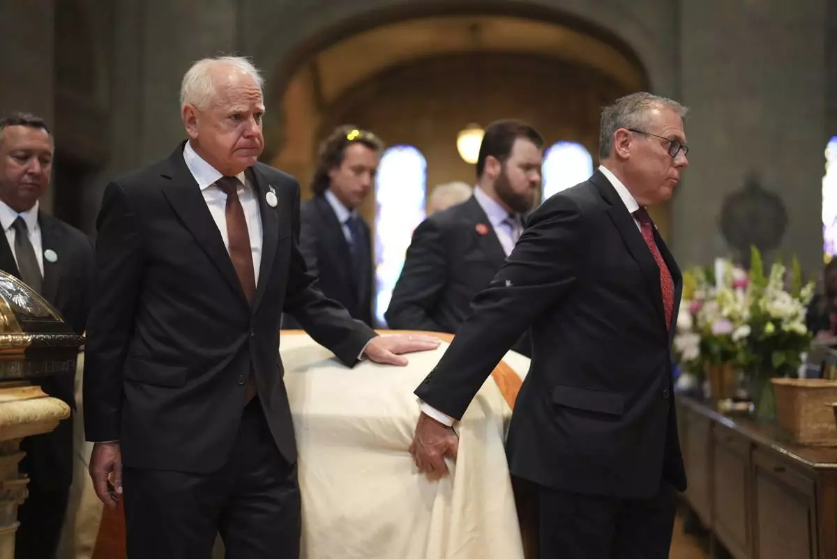 Gov. Tim Walz, left, walks with Melissa Hortman's casket as it is processed through the aisle in the sanctuary at the Basilica of St. Mary during funeral services for Mark and Melissa Hortman in Minneapolis, Minn., on Saturday, June 28, 2025. (Alex Kormann/Star Tribune via AP, Pool)