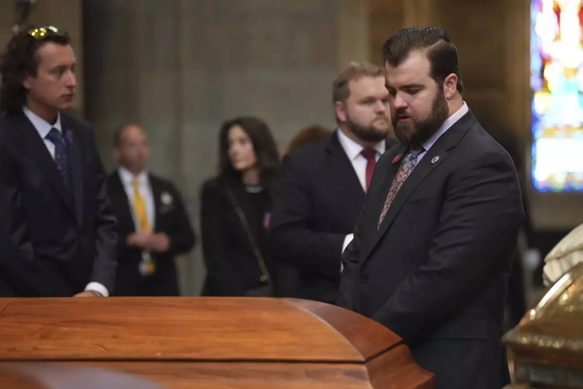 Colin Hortman, son of Melissa and Mark Hortman, views the caskets in the sanctuary of the Basilica of St. Mary before funeral services for Mark and Melissa Hortman in Minneapolis, Minn., on Saturday, June 28, 2025. (Alex Kormann /Star Tribune via AP, Pool)