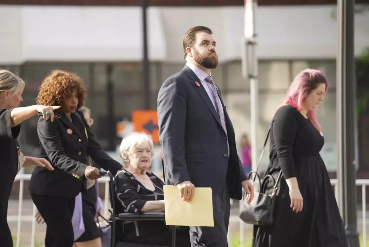 Colin Hortman, son of Melissa and Mark Hortman, arrives with other family members before funeral services for Mark and Melissa Hortman at the Basilica of St. Mary in Minneapolis, Minn., on Saturday, June 28, 2025. (Alex Kormann/Star Tribune via AP)