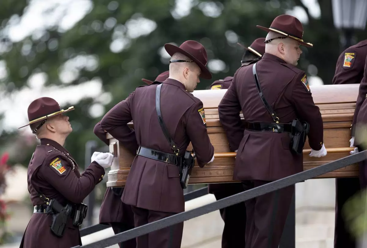 Conservation officers carry the casket of Melissa Hortman into the Basilica of St. Mary before funeral services for Mark and Melissa Hortman in Minneapolis, Minn., on Saturday, June 28, 2025. (Jeff Wheeler/Star Tribune via AP)