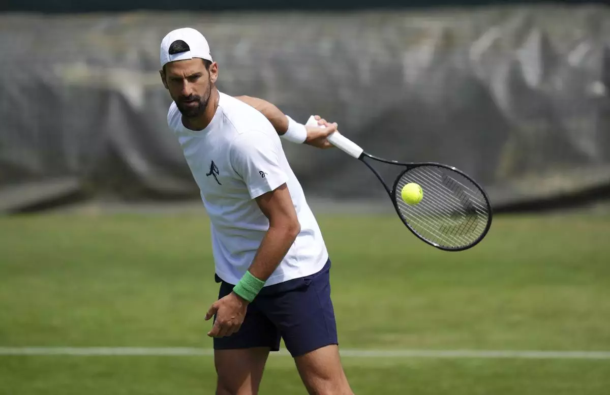 Novak Djokovic during a practice session at the All England Lawn Tennis and Croquet Club in Wimbledon ahead of the Wimbledon Championships, Friday June 27, 2025. (John Walton/PA via AP)