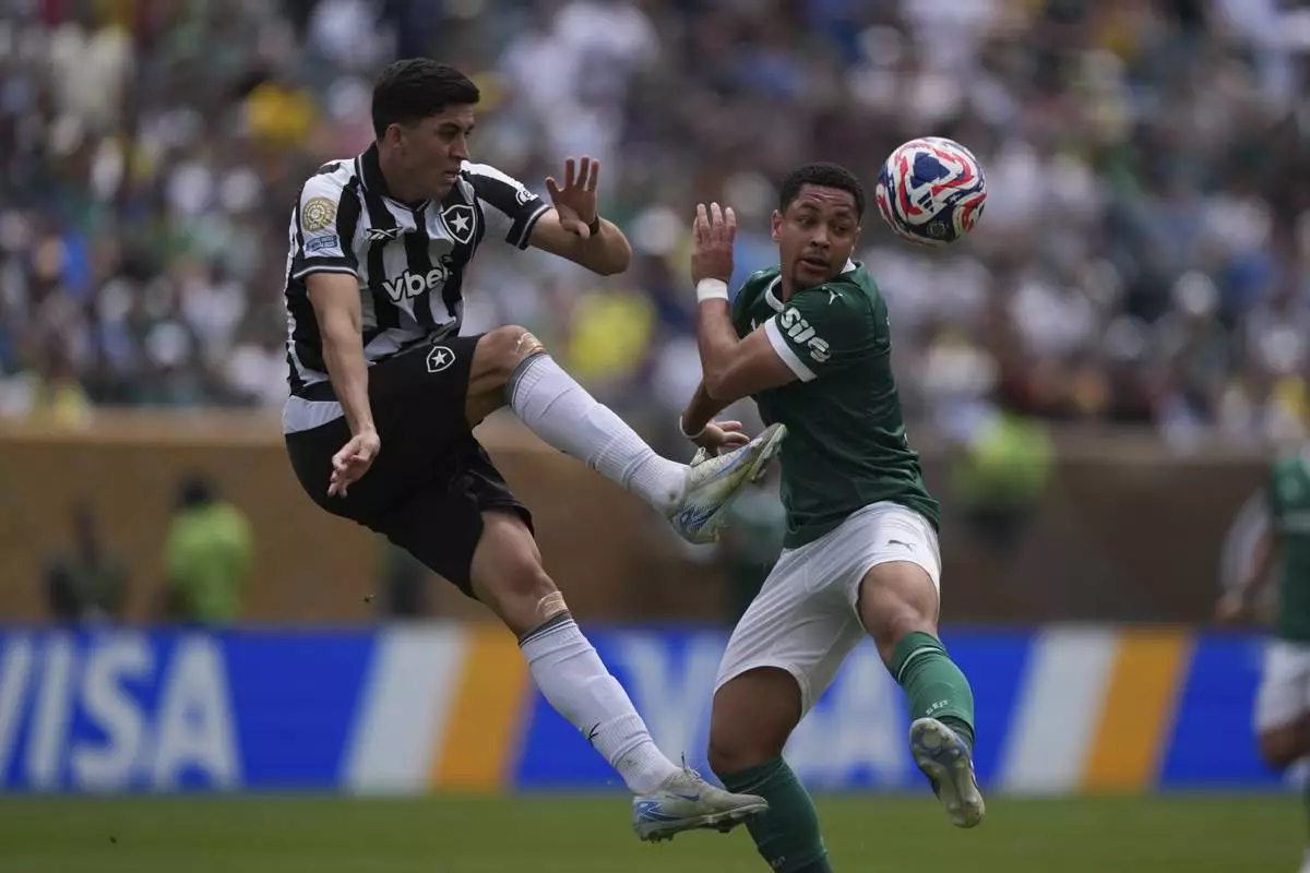 Palmeiras' Emiliano Martinez, right, and Botafogo's Rwan Cruz compete for the ball during the Club World Cup round of 16 soccer match between Palmeiras and Botafogo in Philadelphia, Sunday, June 29, 2025. (AP Photo/Matt Slocum)