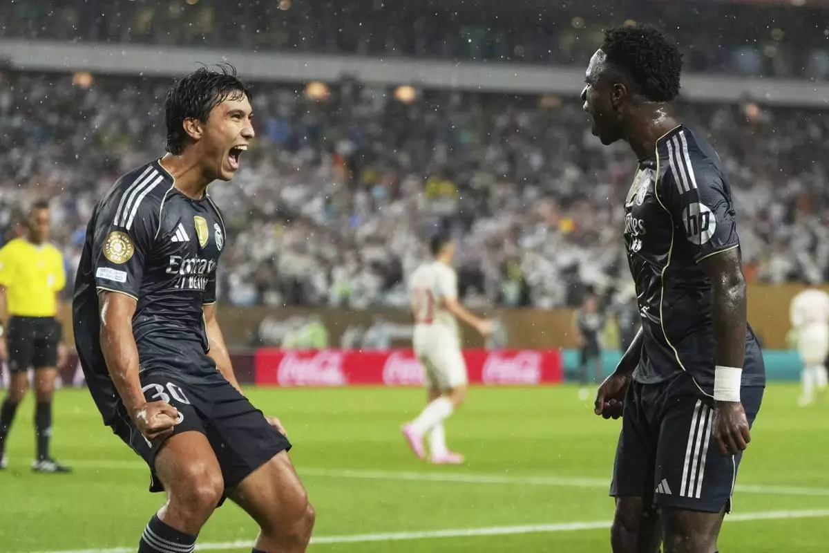 Real Madrid's Vinicius Junior celebrates with teammate Gonzalo Garcia, left, after scoring his team's first goal during the Club World Cup Group H soccer match between Salzburg and Real Madrid in Philadelphia, Thursday, June 26, 2025. (AP Photo/Matt Slocum)