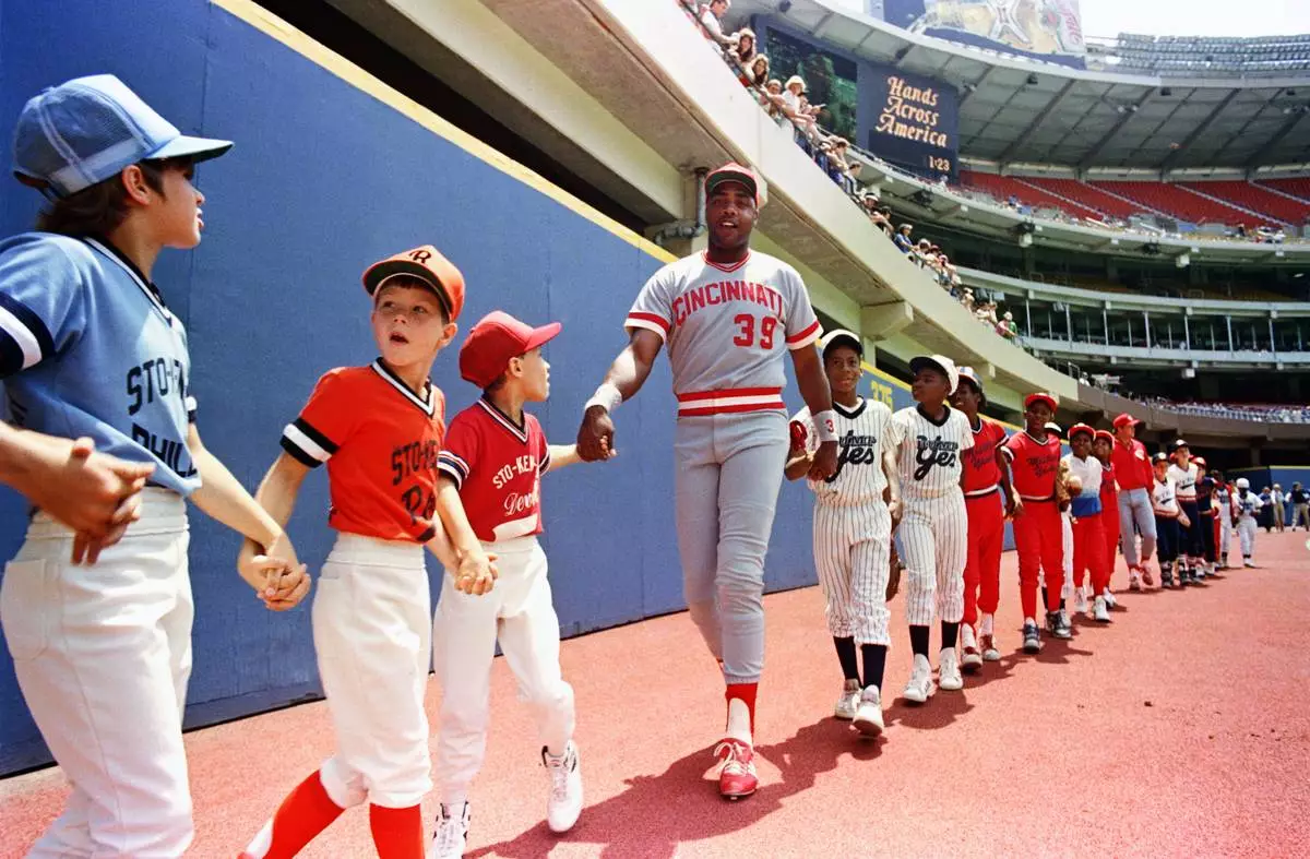 FILE - Cincinnati Reds Dave Parker joins hands with Pittsburgh area little leaguers during a pre-game Hands Across America celebration in Three Rivers Stadium in Pittsburgh, May 25, 1986. (AP Photo/Gene J. Puskar, File)