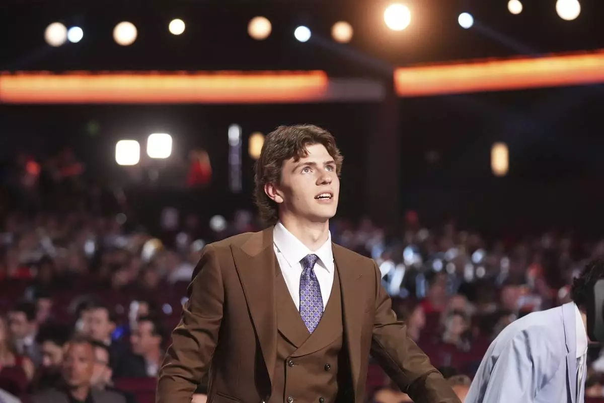 Jack Nesbitt walks to the stage after being drafted by the Philadelphia Flyers during the NHL hockey draft Friday, June 27, 2025, in Los Angeles. (AP Photo/Damian Dovarganes)