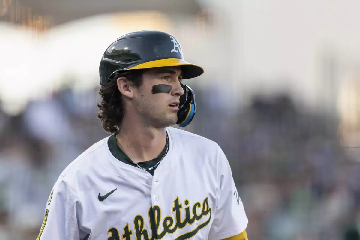 Athletics' Jacob Wilson watches the pitcher while on deck during the first inning of a baseball game against the Cleveland Guardians Friday, June 20, 2025, in West Sacramento, Calif. (AP Photo/Sara Nevis)