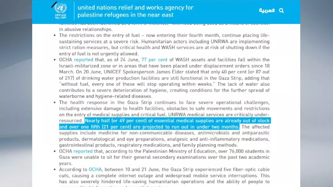 A report released on Friday by the United Nations Relief and Works Agency for Palestine Refugees in the Near East (UNRWA) stated that the health response in the Gaza Strip has been severely hampered by damaged facilities, movement restrictions, and limited access to medical supplies and fuel.