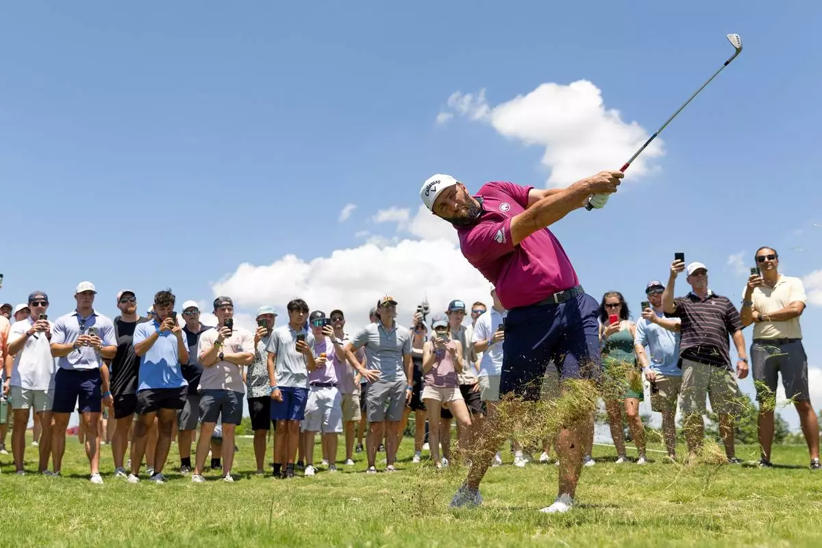 Captain Jon Rahm, of Legion XIII, hits from tthe rough on the seventh hole during the second round of LIV Golf Dallas at Maridoe Golf Club, Saturday, June 28, 2025, in Carrollton, Texas. (Jon Ferrey/LIV Golf via AP)