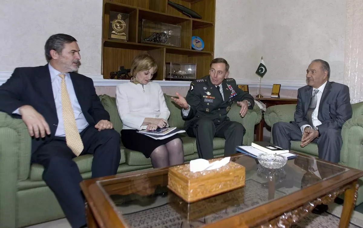 FILE - From left, U.S. Assistant Secretary of State Richard Boucher, U.S. ambassador to Pakistan Anne W. Patterson and U.S. Central Command General David Petraeus speak with Pakistan's Defense Minister Chaudhry Ahmed Mukhtar, right, during their meeting in Rawalpindi, Pakistan on Nov. 3, 2008. AP Photo/Anjum Naveed, File)