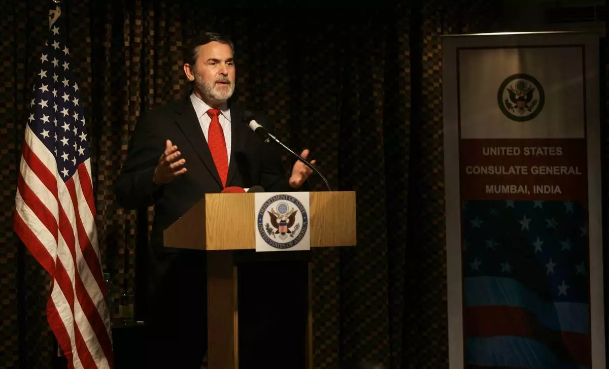 FILE - U.S. Assistant Secretary of State Richard Boucher speaks during a press conference in Mumbai, India, Jan. 9, 2009. (AP Photo/Rajanish Kakade, File)