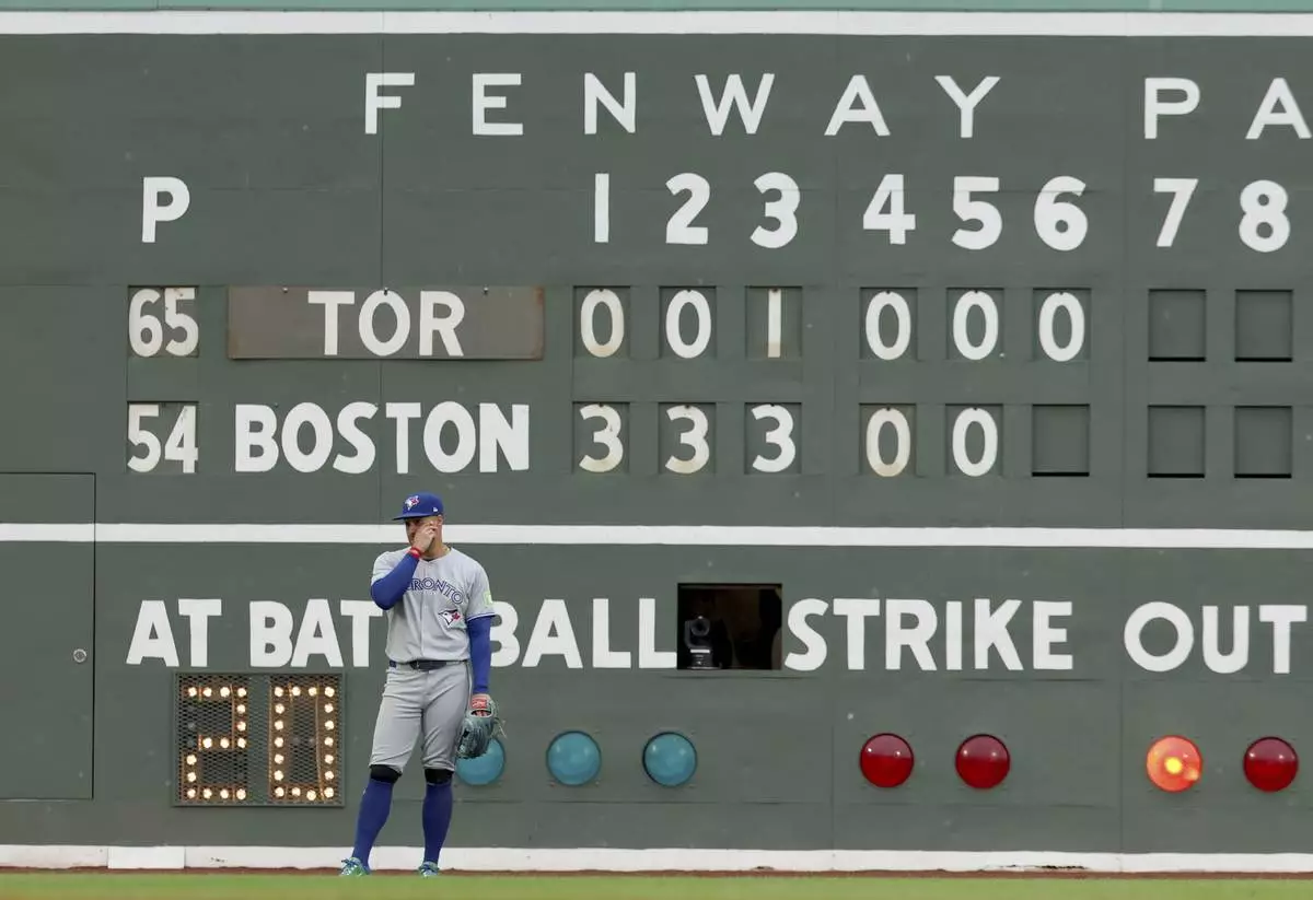 Toronto Blue Jays outfielder George Springer stands in front of the scoreboard during the sixth inning of a baseball game against the Boston Red Sox, Saturday, June 28, 2025, in Boston. (AP Photo/Mark Stockwell)