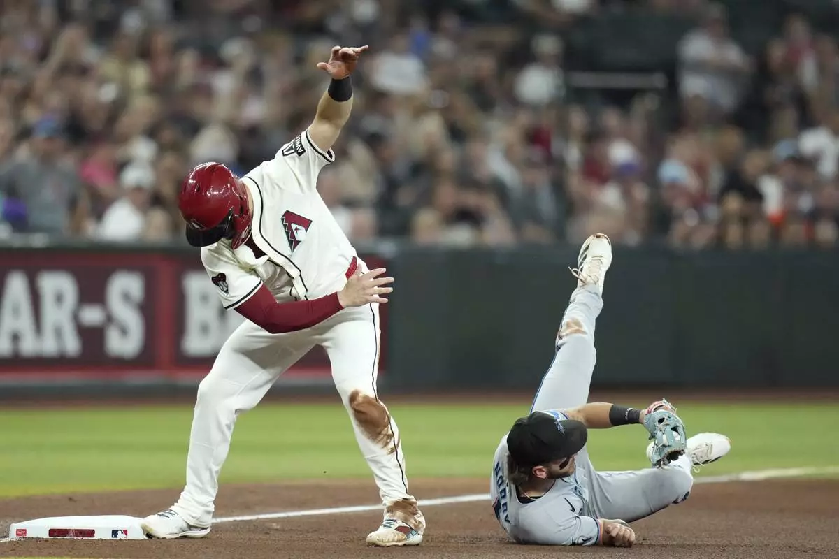 Arizona Diamondbacks' Randal Grichuk, left, slides safely into third base as Miami Marlins third baseman Connor Norby dives to make a catch on a throw from the outfield during the fourth inning of a baseball game Saturday, June 28, 2025, in Phoenix. (AP Photo/Ross D. Franklin)