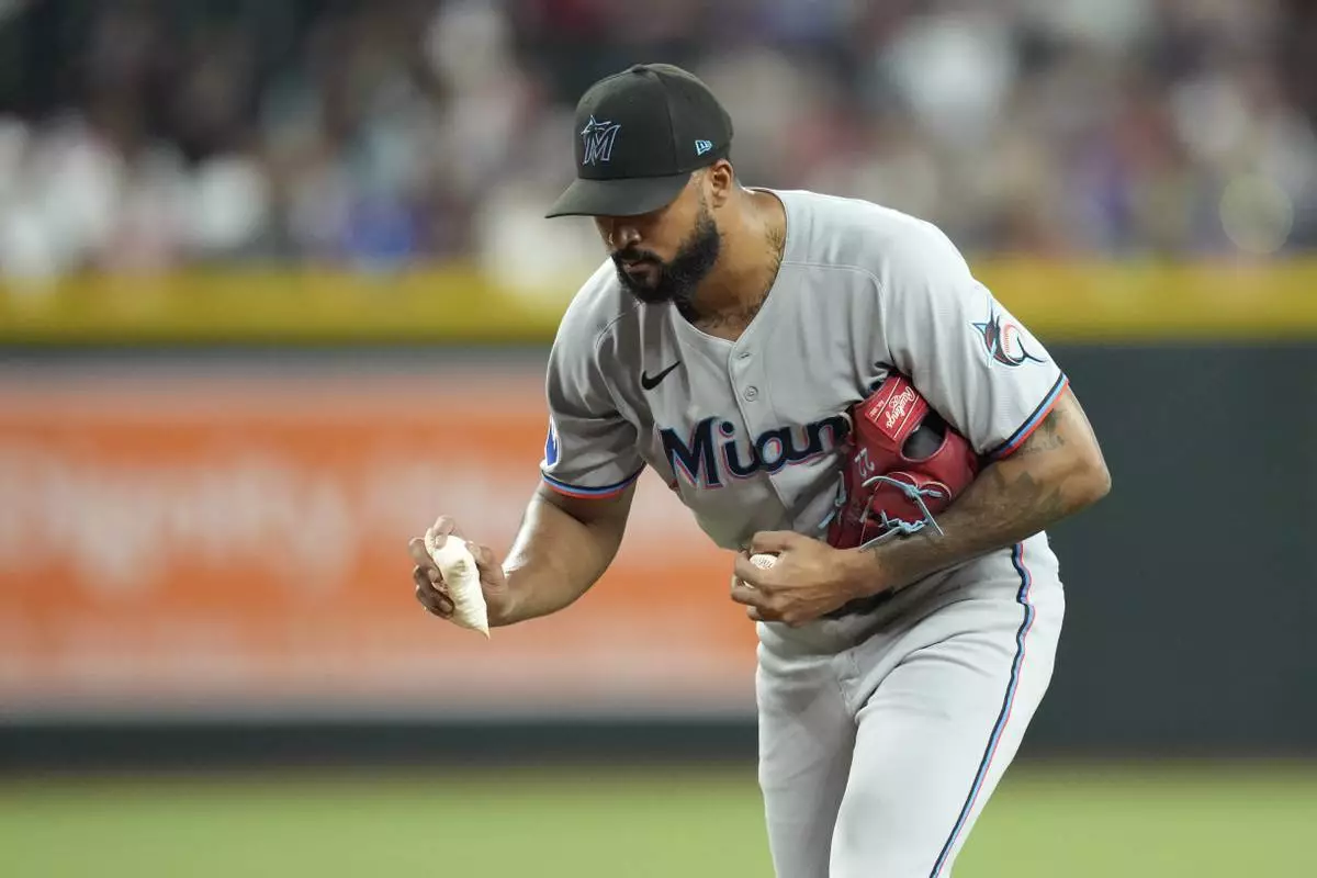 Miami Marlins starting pitcher Sandy Alcantara tosses away the rosin bag during the fourth inning of a baseball game against the Arizona Diamondbacks Saturday, June 28, 2025, in Phoenix. (AP Photo/Ross D. Franklin)