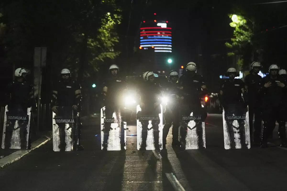 Riot police take positions on a street during a major anti-government rally pressing for an early election after nearly eight months of almost daily anti-corruption demonstrations that have shaken the populist government of President Aleksandar Vucic, in Belgrade, Serbia, Saturday, June 28, 2025. (AP Photo/Marko Drobnjakovic)