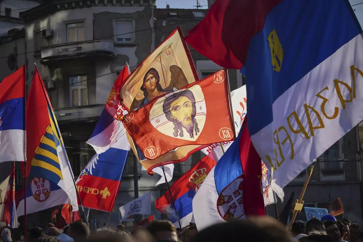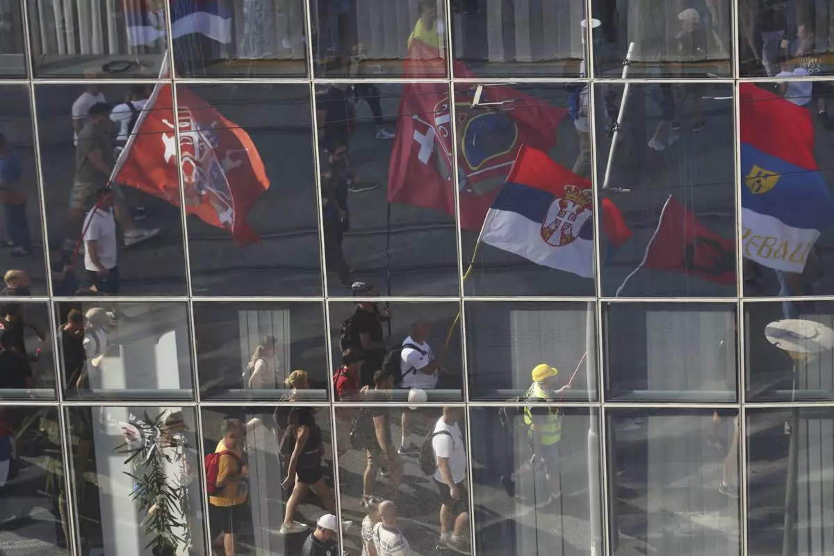 People attend a major anti-government rally in Belgrade, Serbia, Saturday, June 28, 2025. (AP Photo/Marko Drobnjakovic)