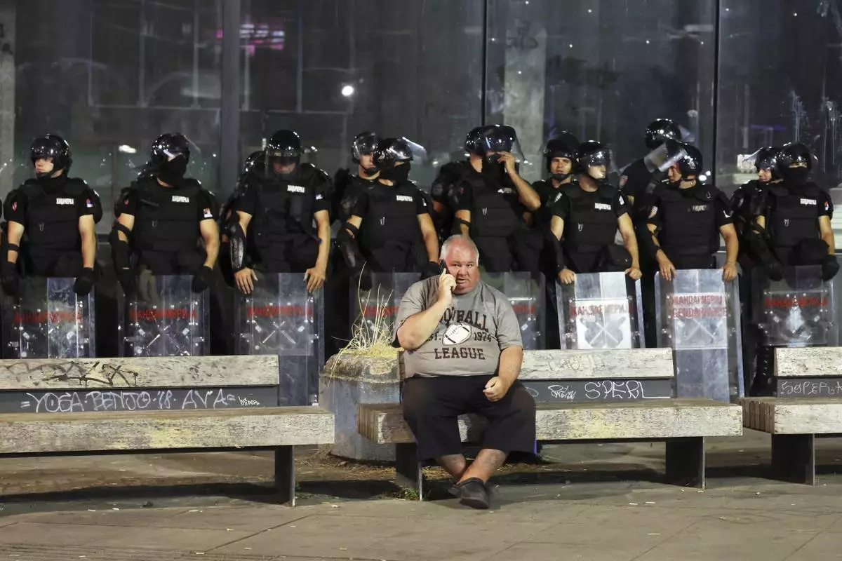 A man speaks on a mobile phone as riot police guards the area at the end of an anti-government rally pressing for an early election after nearly eight months of almost daily anti-corruption demonstrations that have shaken the populist government of President Aleksandar Vucic, in Belgrade, Serbia, Saturday, June 28, 2025. (AP Photo/Marko Drobnjakovic)