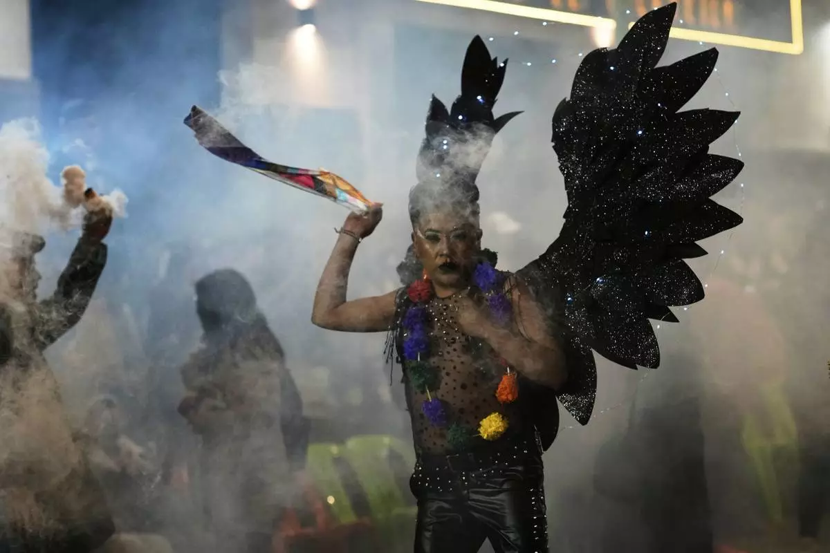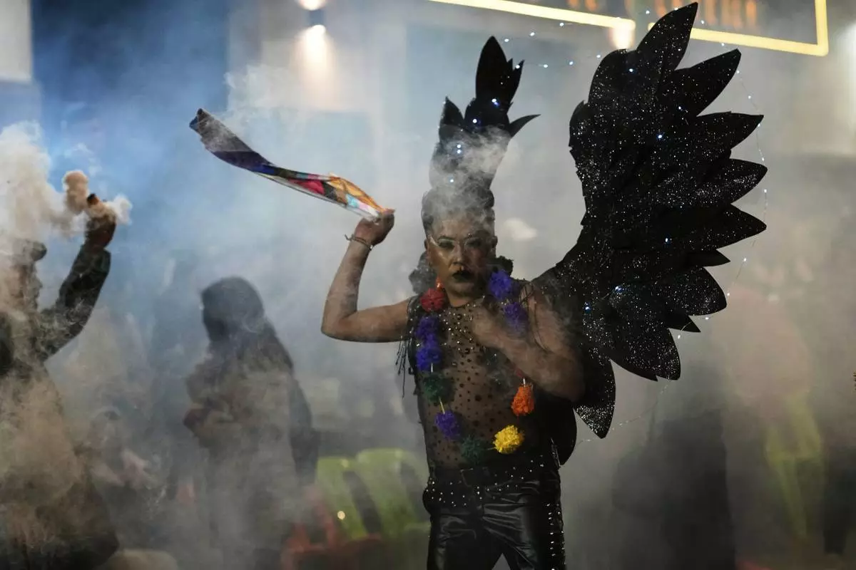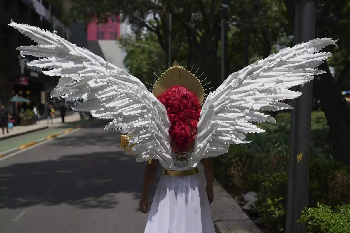 A participant wearing angel wings takes part in the annual Pride march in Mexico City, Saturday, June 28, 2025. (AP Photo/Eduardo Verdugo)