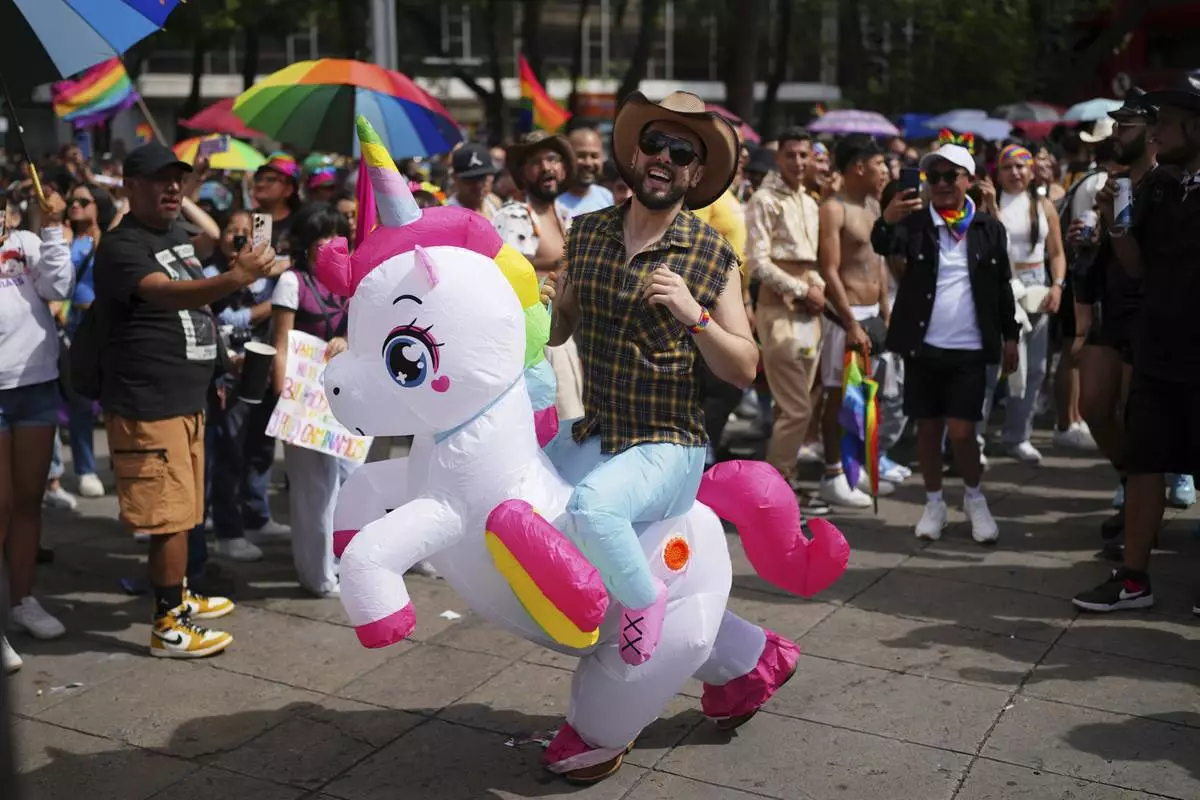 A participant rides on the back of a fellow participant wearing a unicorn costume in the annual Pride Parade in Mexico City, Saturday, June 28, 2025. (AP Photo/Eduardo Verdugo)