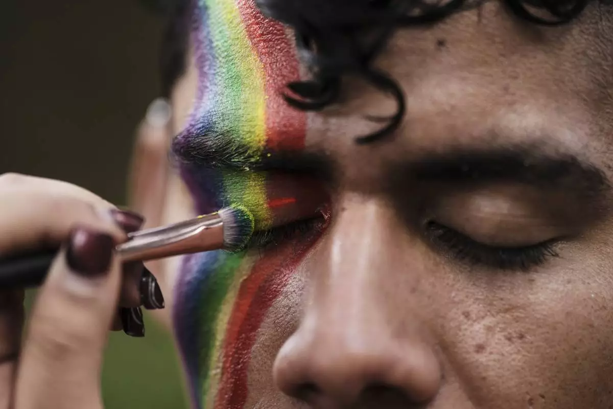 A reveler gets made up before the start the annual Pride parade marking LGBTQ+ Pride month in Bogota, Colombia, Sunday, June 29, 2025. (AP Photo/Ivan Valencia )