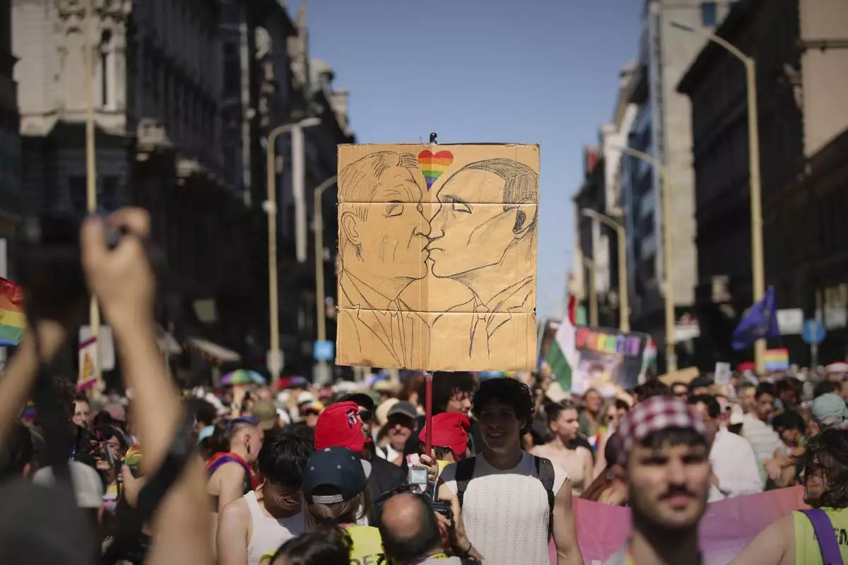 Participant in the Pride march hold a drawing made on a piece of cardboard in Budapest, Hungary, Saturday, June 28, 2025. (AP Photo/Rudolf Karancsi)