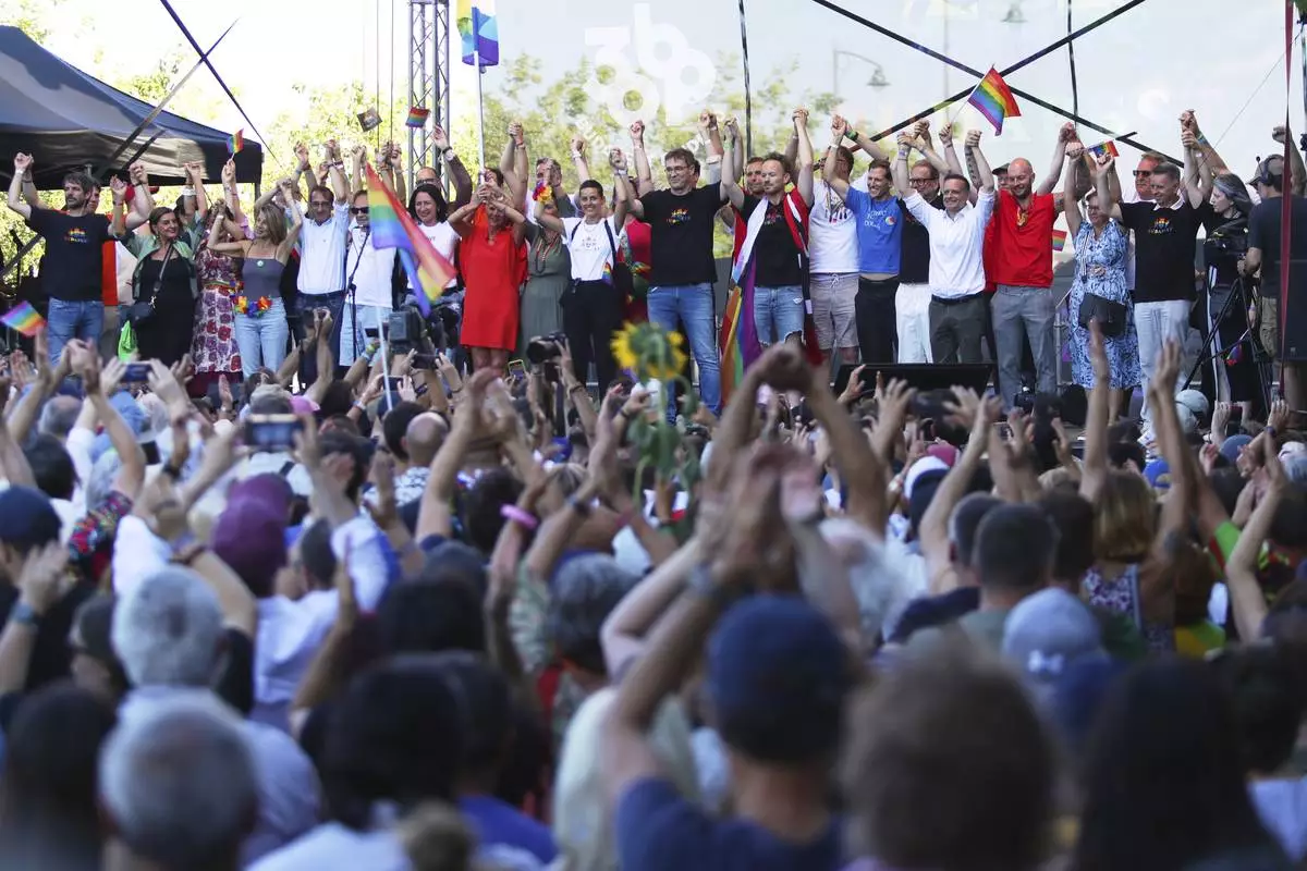 Budapest mayor Gergely Karacsony, center, holds his hands up along with European Union representatives during the Pride march in Budapest, Hungary, Saturday, June 28, 2025. (AP Photo/Rudolf Karancsi)