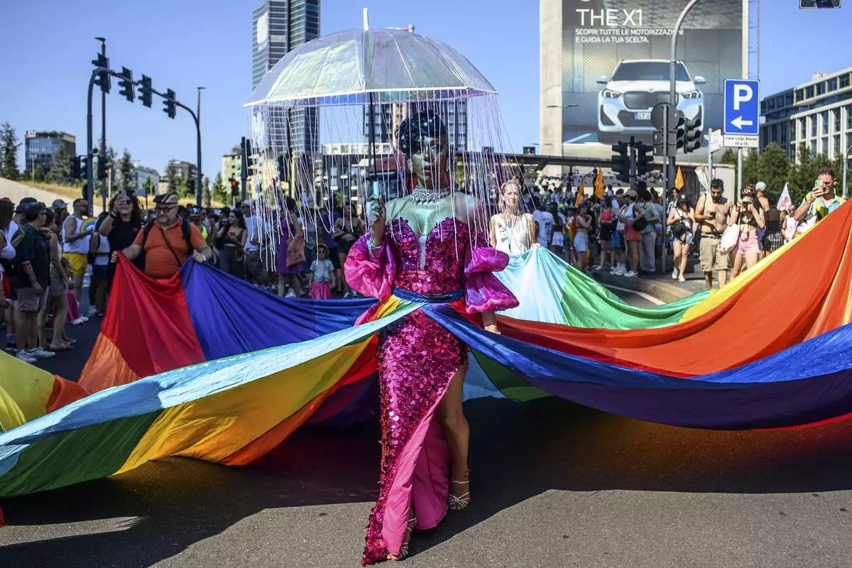 Participants march during the Milano Pride parade in Milan, Saturday, June 28, 2025. (Claudio Furlan/LaPresse via AP)