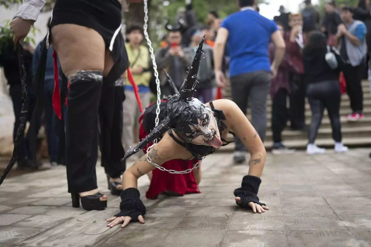 Members of LGTBIQ+ community perform before the start of the Pride March in Asuncion, Paraguay, Saturday, June 28, 2025. (AP Photo/Jorge Saenz)