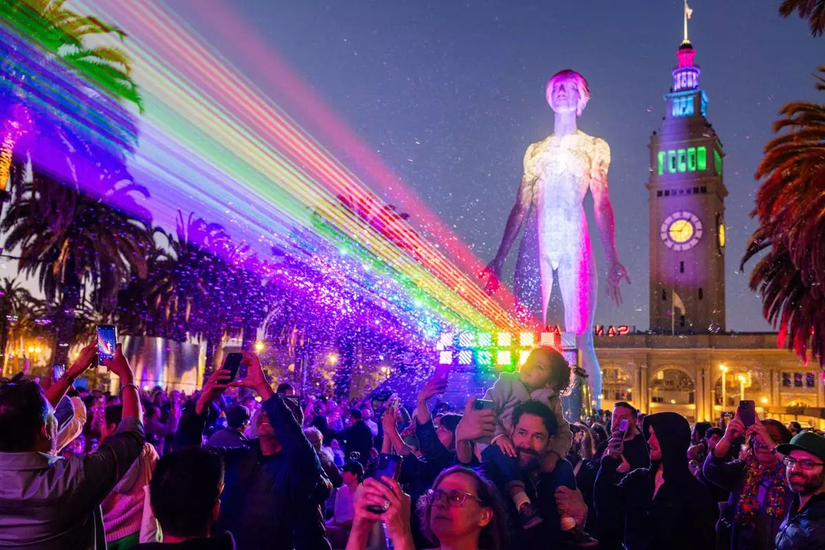 Rainbow lasers create a pride flag projected on Market Street from the Ferry Building during a ceremony for the 55th annual Pride Celebration in San Francisco on Friday, June 27, 2025. (Santiago Mejia/San Francisco Chronicle via AP)