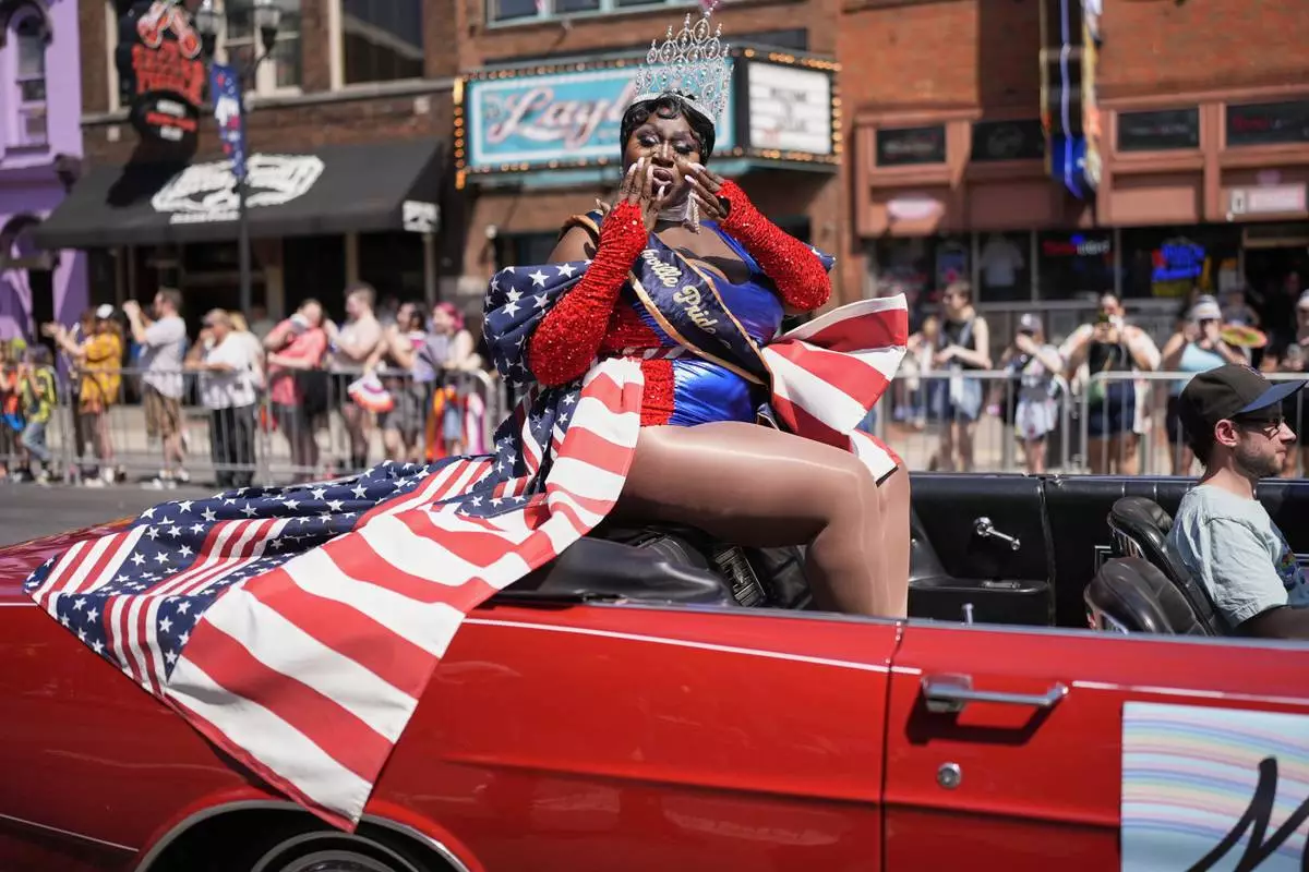 Denise "Nece Sexton" Sadler blows kisses to the crowd during the Nashville Pride Parade, Saturday, June 28, 2025, in Nashville, Tenn. (AP Photo/George Walker IV)
