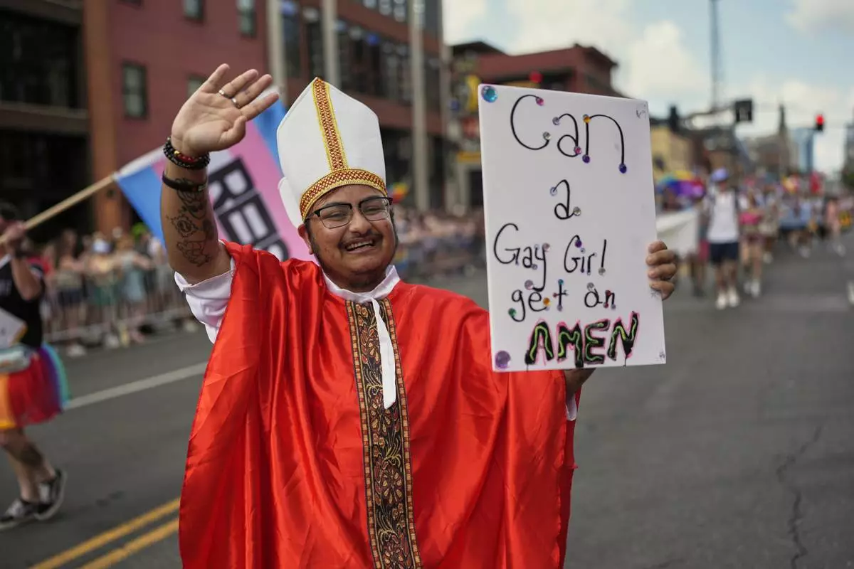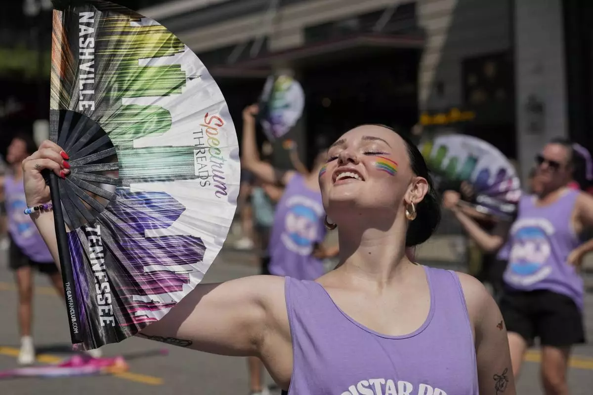 Eryn Keyes walks down Broadway during the Nashville Pride Parade, Saturday, June 28, 2025, in Nashville, Tenn. (AP Photo/George Walker IV)