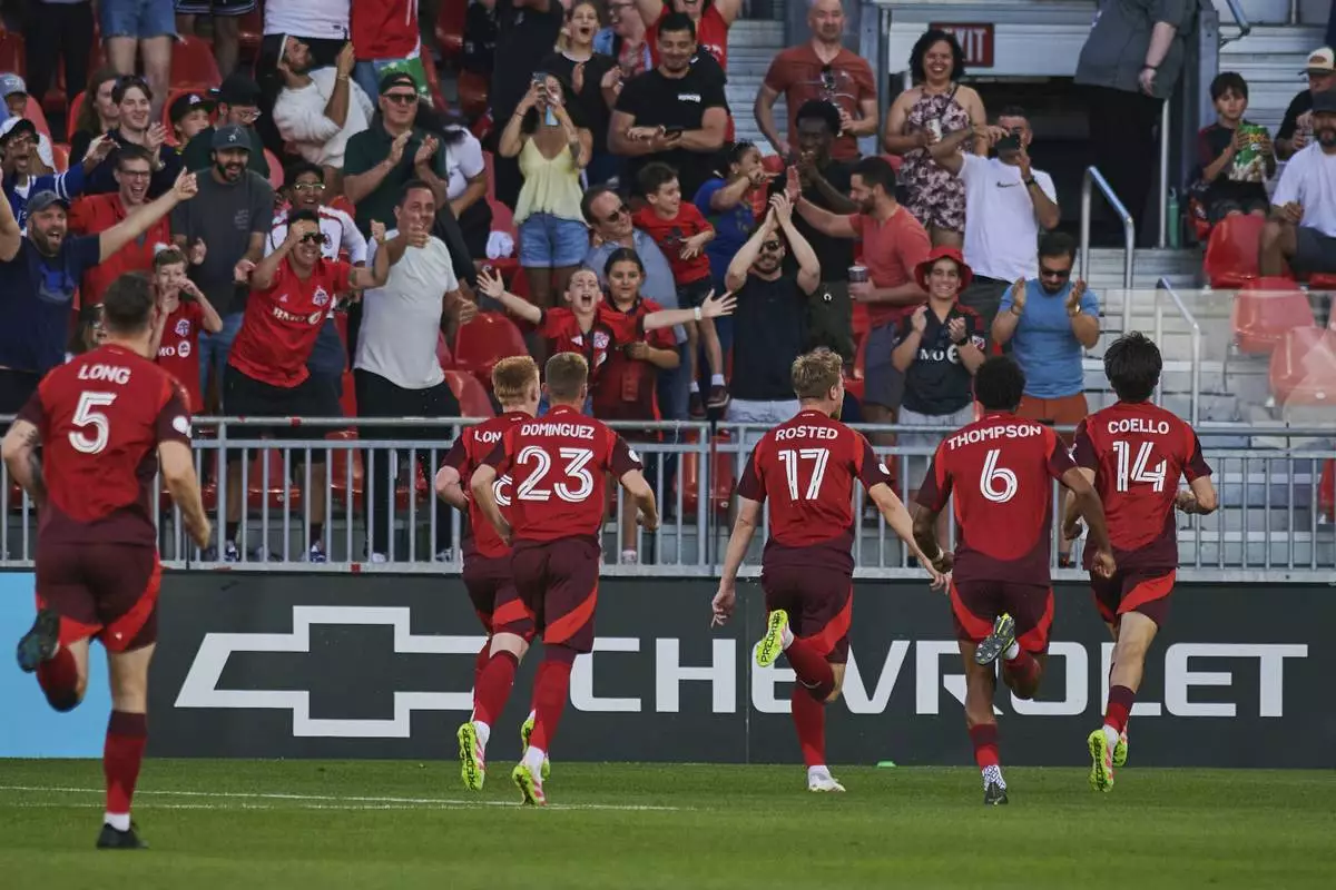 Toronto FC midfielder Alonso Coello (14) celebrates his goal with teammates during first half MLS action against the Portland Timbers, in Toronto, Saturday, June 28, 2025. (Sammy Kogan/The Canadian Press via AP)