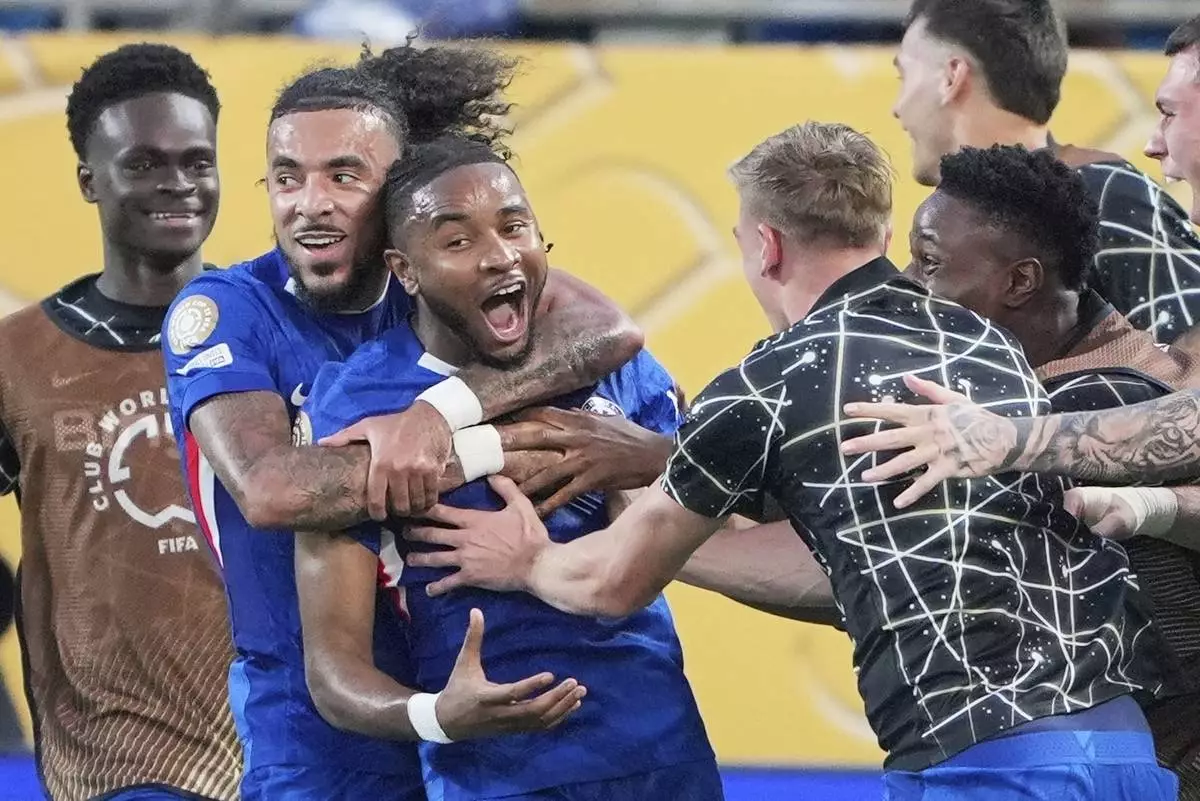 Chelsea's Christopher Nkunku is congratulated after scoring his teams second goal during the Club World Cup round of 16 soccer match between Benfica and Chelsea in Charlotte, N.C., Saturday, June 28, 2025. (AP Photo/Chris Carlson)