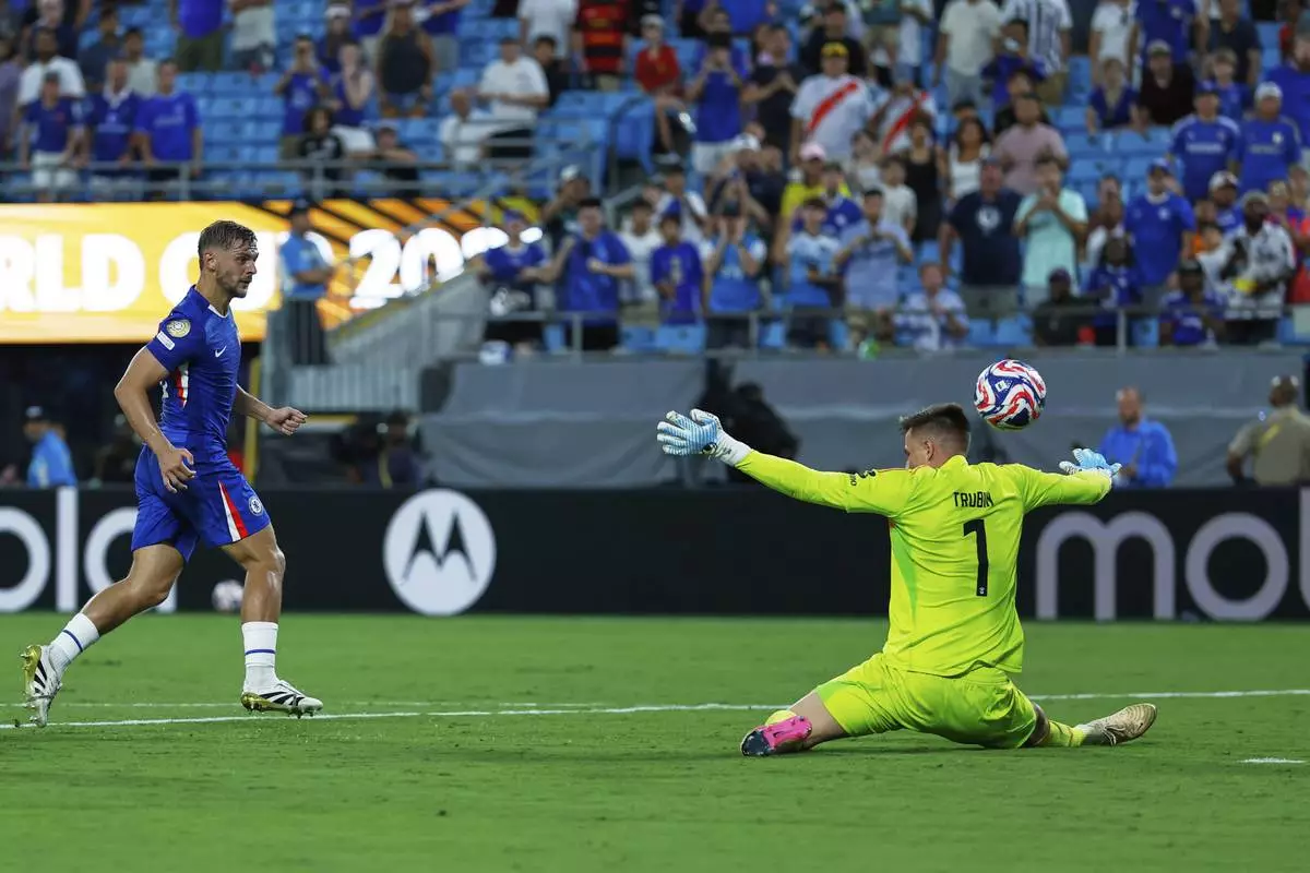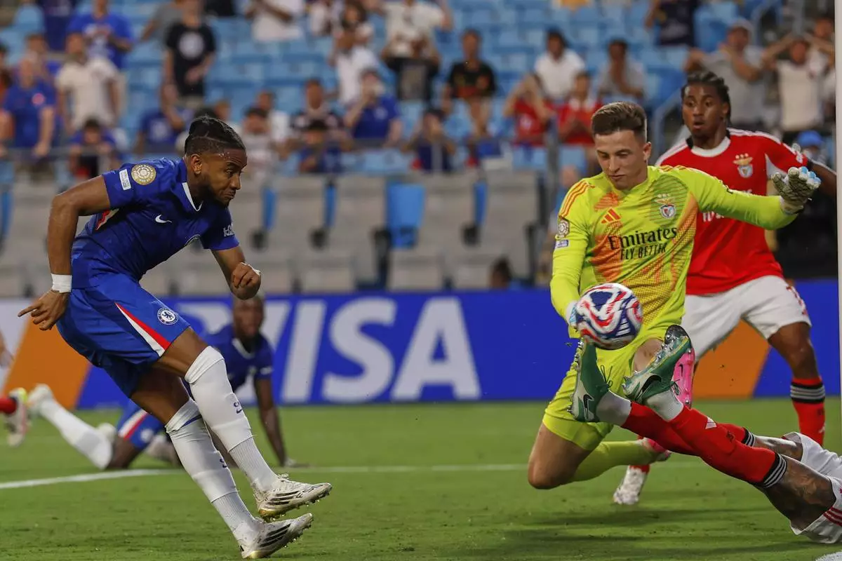 Chelsea's Kiernan Dewsbury-Hall, left, scores his side's fourth goal against Benfica's goalkeeper Anatoliy Trubin during the Club World Cup round of 16 soccer match between Benfica and Chelsea in Charlotte, N.C., Saturday, June 28, 2025. (AP Photo/Nell Redmond)