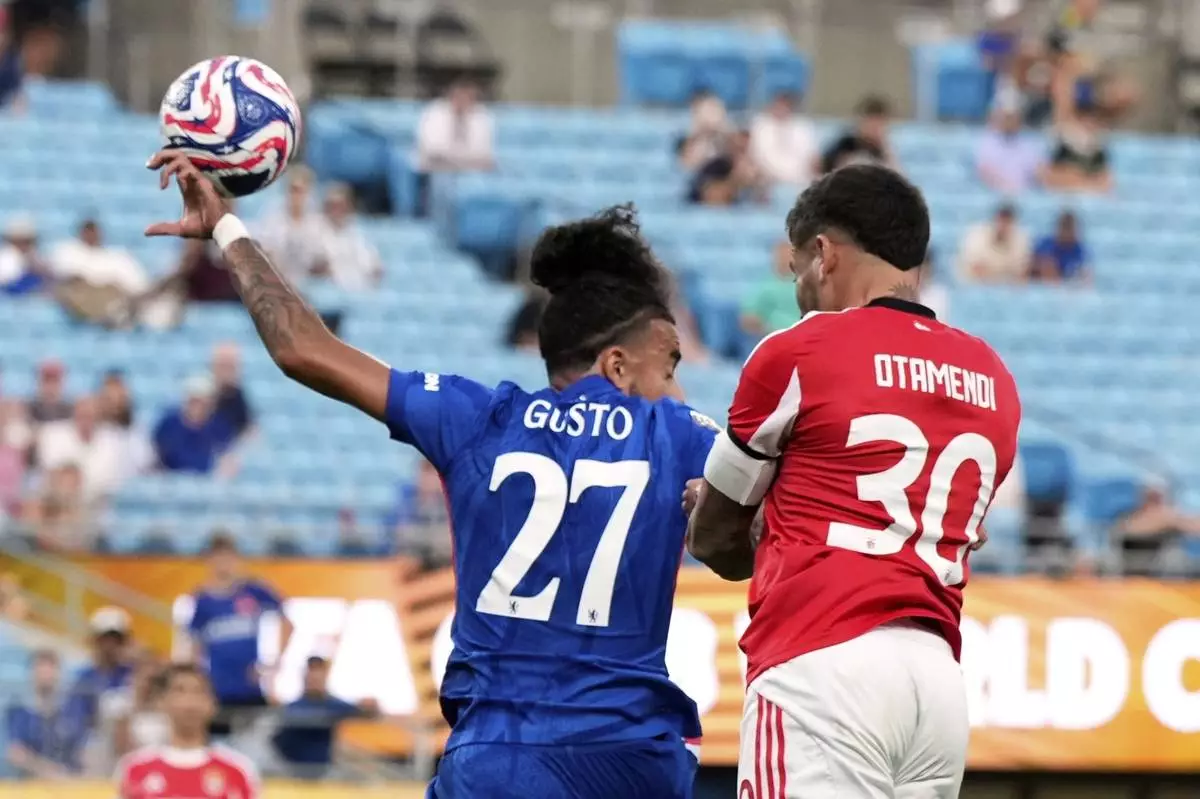 Chelsea's Malo Gusto is called for a hand ball against Benfica's Nicolas Otamendi during the Club World Cup round of 16 soccer match between Benfica and Chelsea in Charlotte, N.C., Saturday, June 28, 2025. (AP Photo/Chris Carlson)