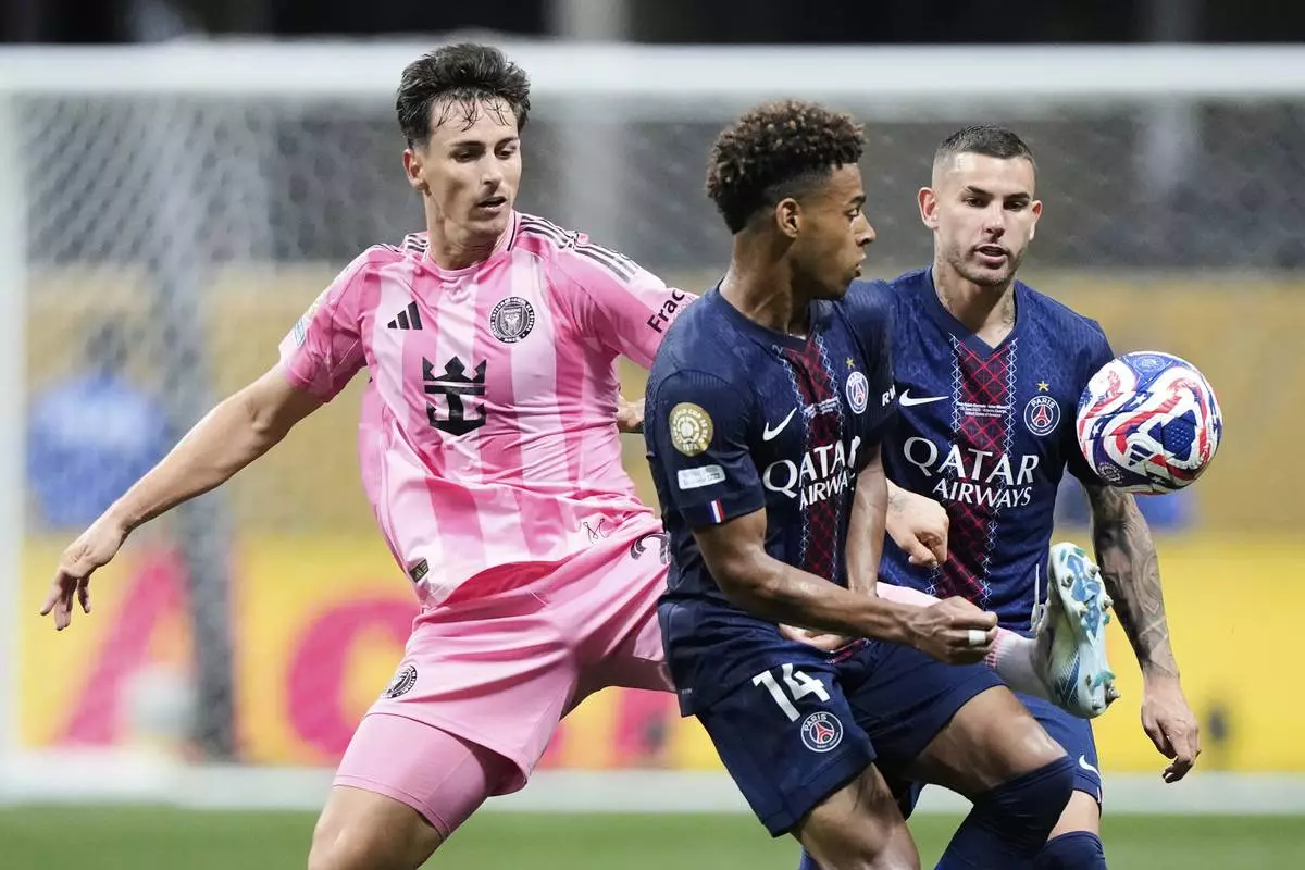 Inter Miami's Tadeo Allende, left, controls the ball against Paris Saint-Germain's Desire Doue, center, and Lucas Hernandez during the Club World Cup round of 16 soccer match between PSG and Inter Miami in Atlanta, Sunday, June 29, 2025. (AP Photo/Brynn Anderson)