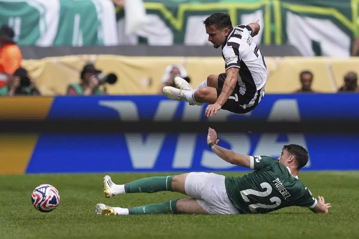 Botafogo's Artur is upended by Palmeiras' Joaquin Piquerez during the Club World Cup round of 16 soccer match between Palmeiras and Botafogo in Philadelphia, Saturday, June 28, 2025. (AP Photo/Matt Rourke)