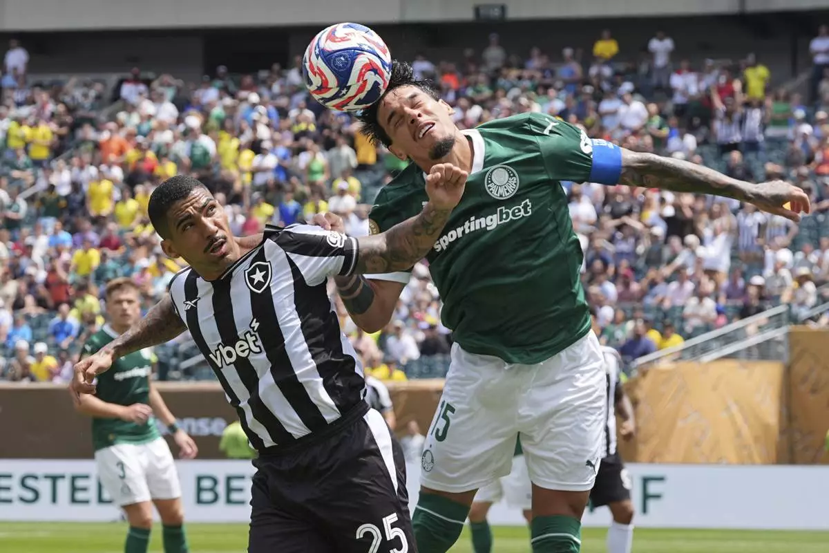 Palmeiras' Gustavo Gomez (15) heads the ball over Botafogo's Allan (25) during the Club World Cup round of 16 soccer match between Palmeiras and Botafogo in Philadelphia, Saturday, June 28, 2025. (AP Photo/Matt Rourke)