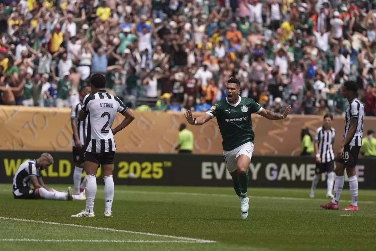 Palmeiras' Paulinho celebrates after scoring his side's opening goal in extra time during the Club World Cup round of 16 soccer match between Palmeiras and Botafogo in Philadelphia, Saturday, June 28, 2025. (AP Photo/Chris Szagola)