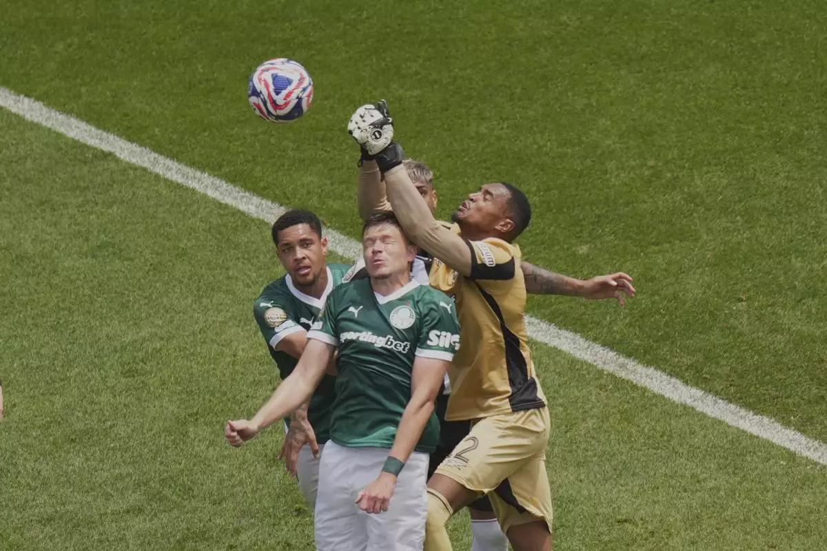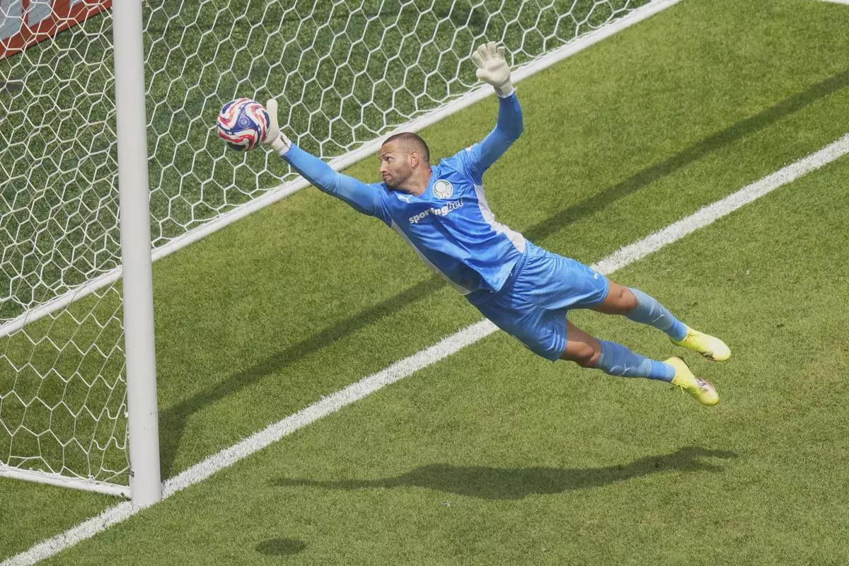 Palmeiras' goalkeeper Weverton makes a save during the Club World Cup round of 16 soccer match between Palmeiras and Botafogo in Philadelphia, Saturday, June 28, 2025. (AP Photo/Chris Szagola)