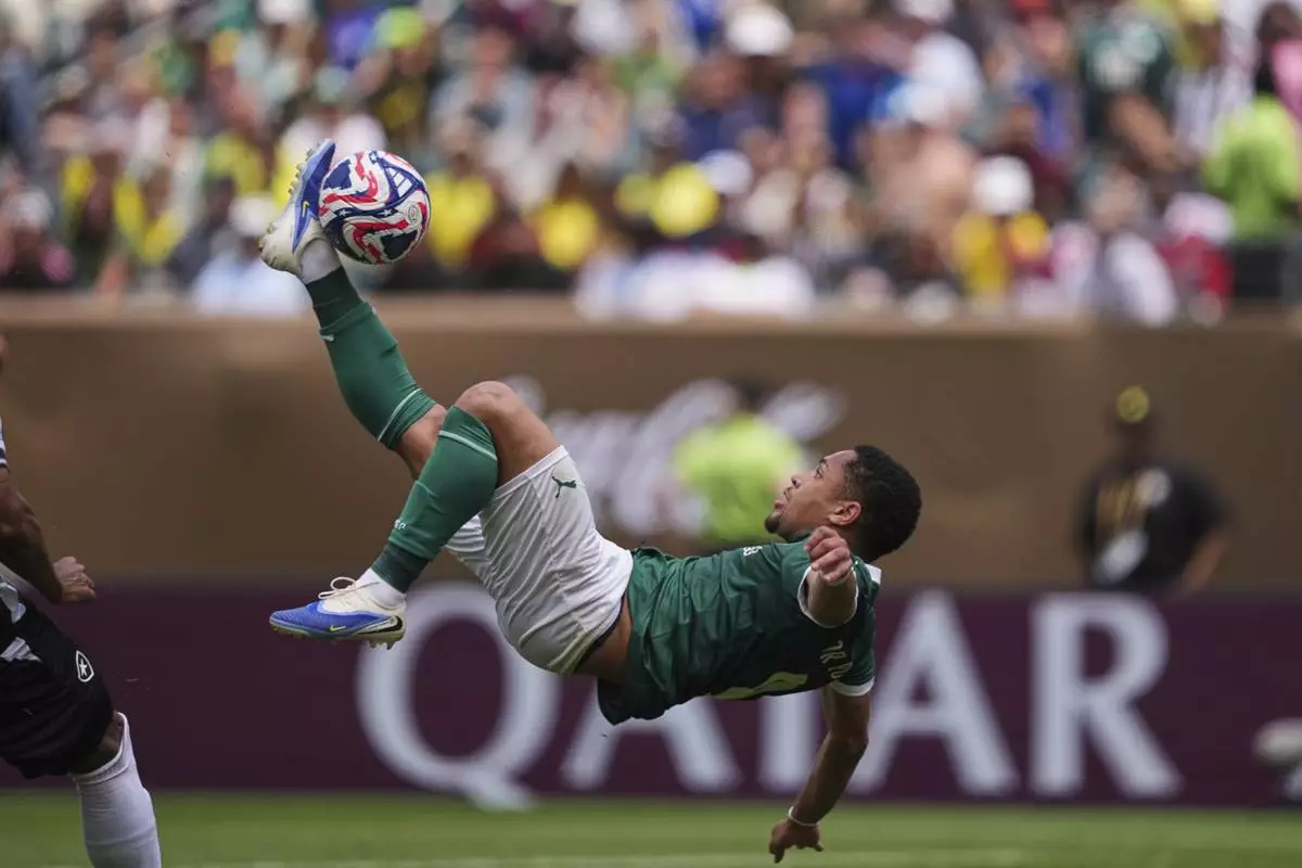 Palmeiras' Vitor Roque (9) attempts a bicycle kick during the Club World Cup round of 16 soccer match between Palmeiras and Botafogo in Philadelphia, Saturday, June 28, 2025. (AP Photo/Matt Rourke)