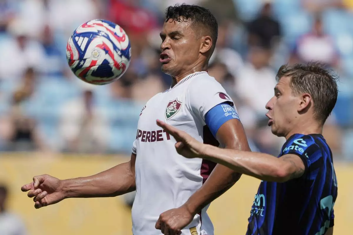 Fluminense's Samuel Xavier (2) plays the ball in front of Inter Milan's Federico Dimarco (32) during the Club World Cup round of 16 soccer match between Inter Milan and Fluminense in Charlotte, N.C., Monday, June 30, 2025. (AP Photo/Nell Redmond)