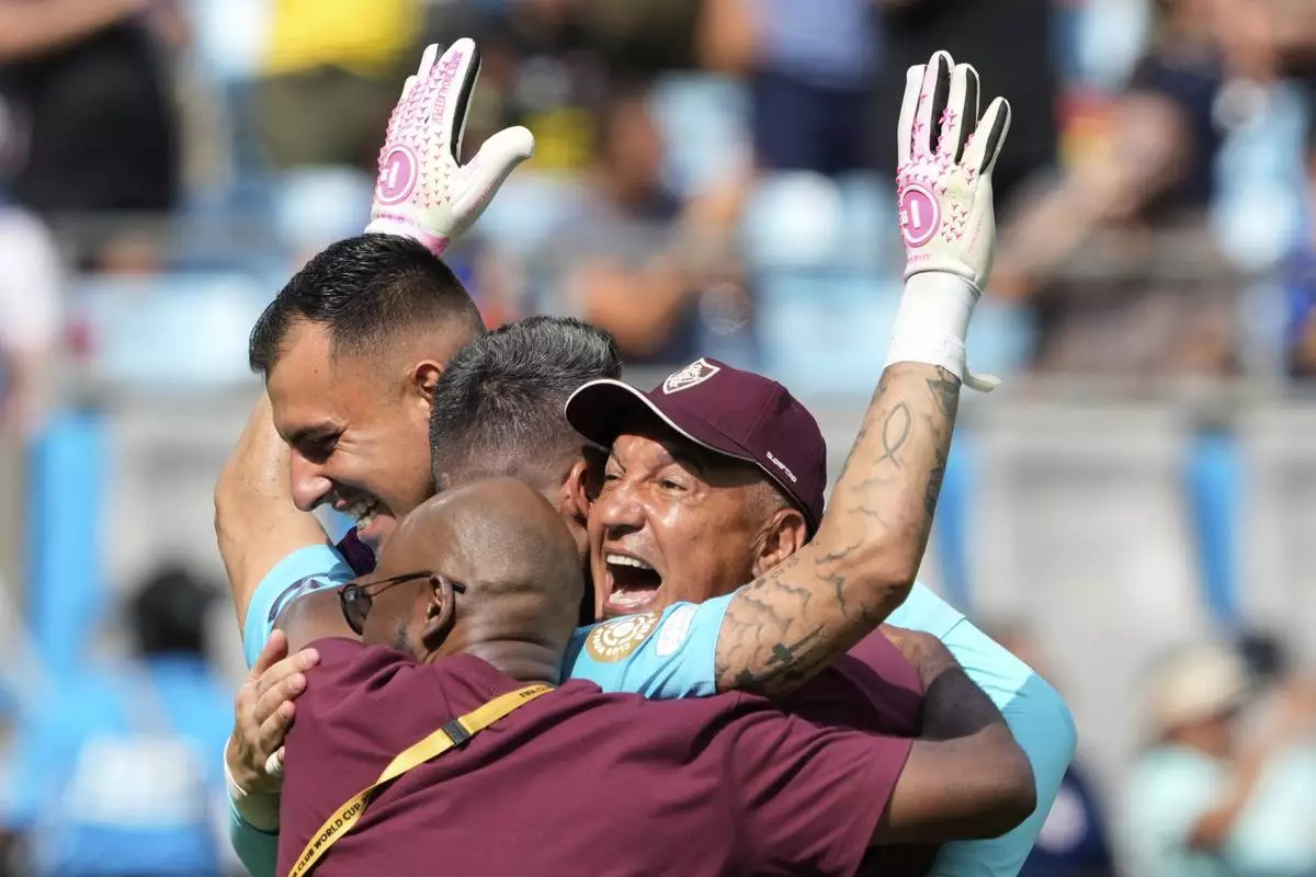 Fluminense's Fabio celebrates with coaches after the Club World Cup round of 16 soccer match between Inter Milan and Fluminense in Charlotte, N.C., Monday, June 30, 2025. (AP Photo/Chris Carlson)