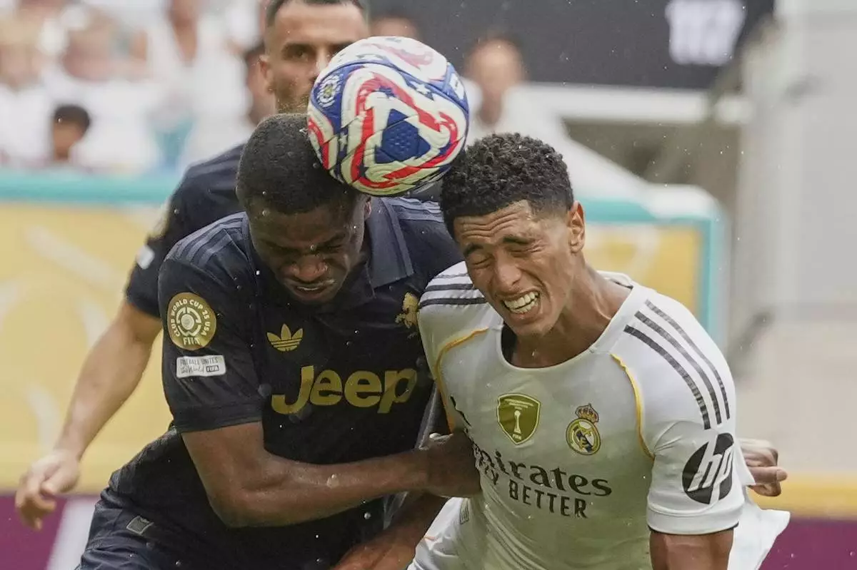 Juventus' Pierre Kalulu, left, and Real Madrid's Jude Bellingham go for the ball during the Club World Cup round of 16 soccer match between Real Madrid and Juventus in Miami Gardens, Fla., Tuesday, July 1, 2025. (AP Photo/Rebecca Blackwell)