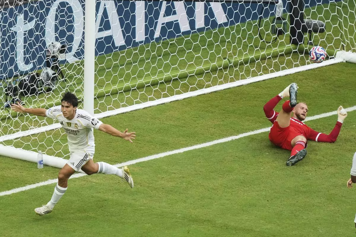 Real Madrid's Gonzalo Garcia (30) celebrates after scoring his side's opening goal during the Club World Cup round of 16 soccer match between Real Madrid and Juventus in Miami Gardens, Fla., Tuesday, July 1, 2025. (AP Photo/Marta Lavandier)