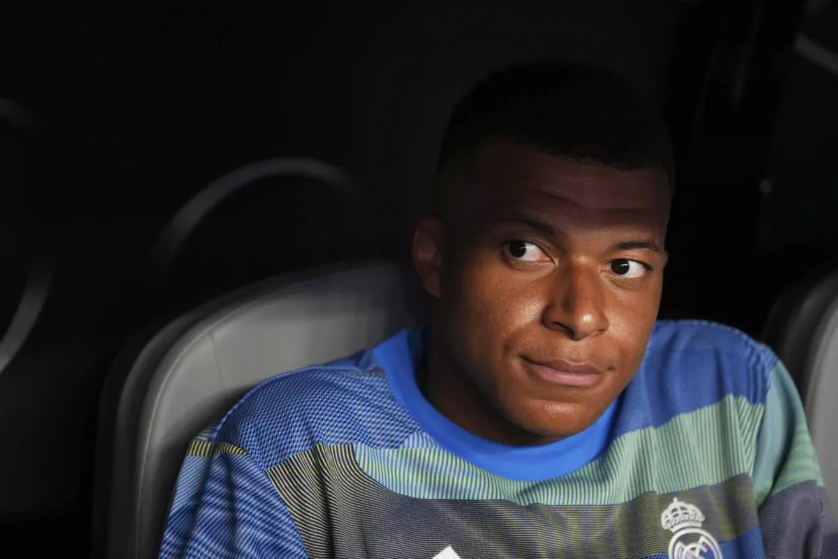 Real Madrid's Kylian Mbappe sits on the bench before the Club World Cup round of 16 soccer match between Real Madrid and Juventus in Miami Gardens, Fla., Tuesday, July 1, 2025. (AP Photo/Rebecca Blackwell)