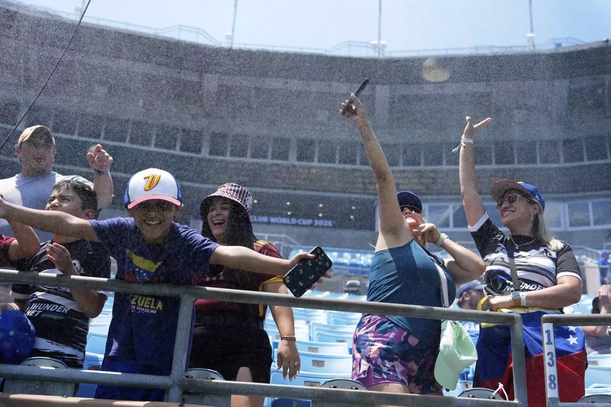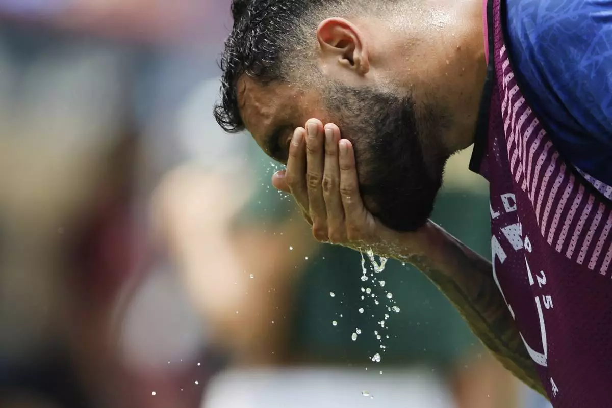Fluminense's Juan Pablo Freytes (22) cools off as he warms up before the Club World Cup round of 16 soccer match between Inter Milan and Fluminense in Charlotte, N.C., Monday, June 30, 2025. (AP Photo/Nell Redmond)