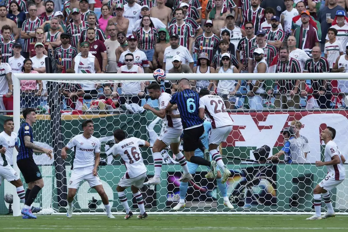Inter Milan's Stefan de Vrij (6), Fluminense's Ignacio (4) and Fluminense's Juan Pablo Freytes (22) challenge for the ball during the Club World Cup round of 16 soccer match between Inter Milan and Fluminense in Charlotte, N.C., Monday, June 30, 2025. (AP Photo/Chris Carlson)